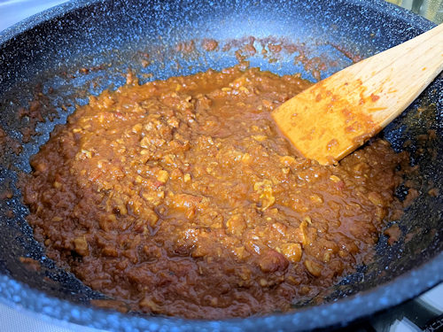 あめ色になったらトマト缶とスパイスを入れてグツグツ