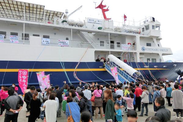 港は見送りの人でいっぱい。あちらこちらで校歌が流れ、拡声器を使って挨拶する声