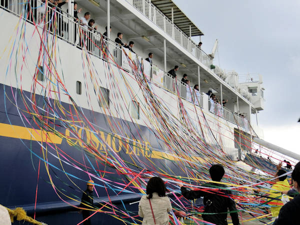 船と見送る人を繋ぐ紙テープが濡れ、プツン!