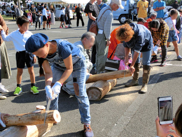 種子島森林組合ブース前で始まった「丸太切り」