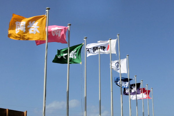 「各校区の団旗」 赤・星原(ホシハラ) 赤白・納官(ノウカン) 紫・増田(マスダ)