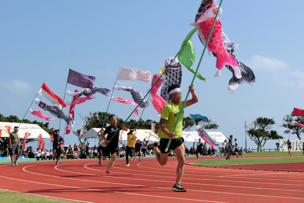鯉のぼりを付けた竿を立てて持ち、8名の男性がリレーします。