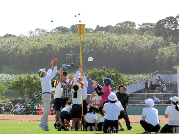 前半は子供だけで玉入れ、その後カゴの高さが上がり、大人が混って後半開始。