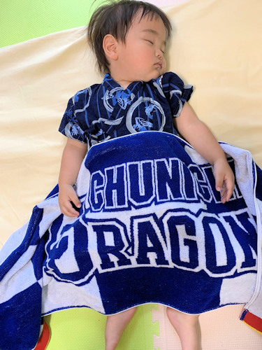 甚平姿でドラゴンズのタオルを掛けてお昼寝。