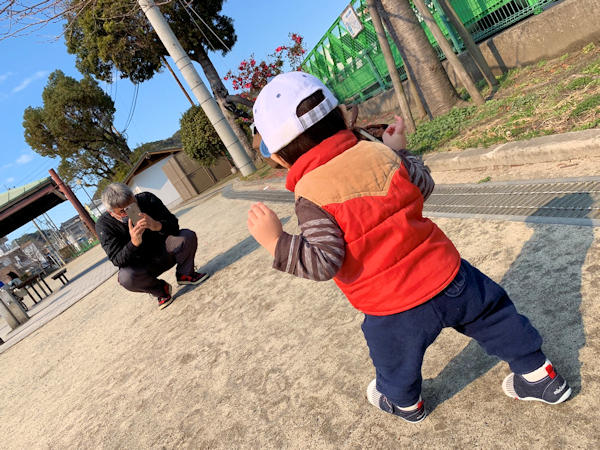 10カ月で歩き始めたちぃ。お外で歩くのは初めて。