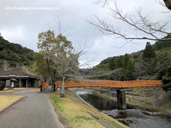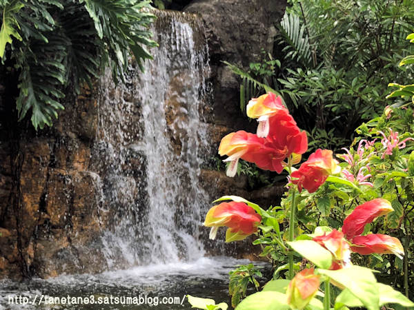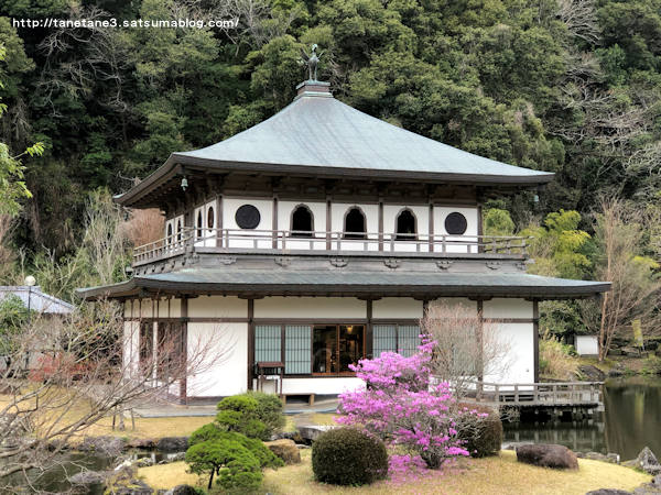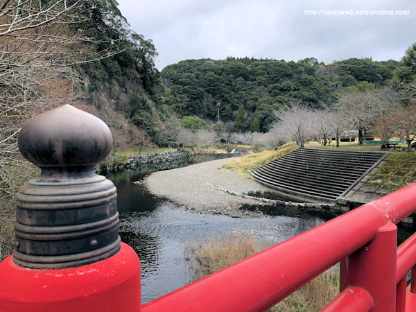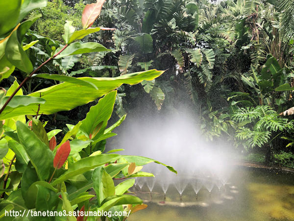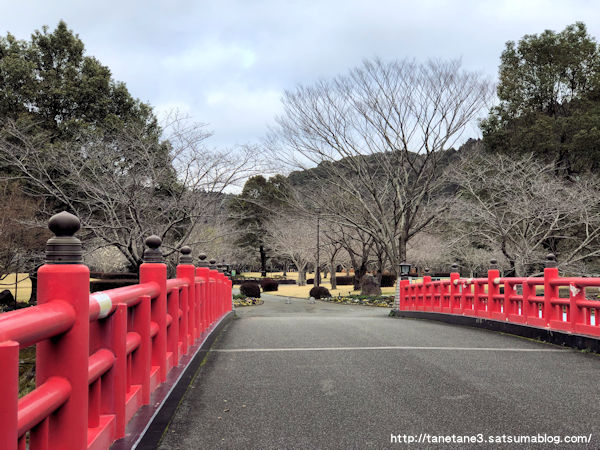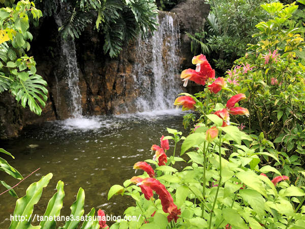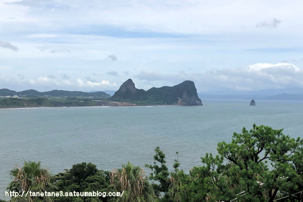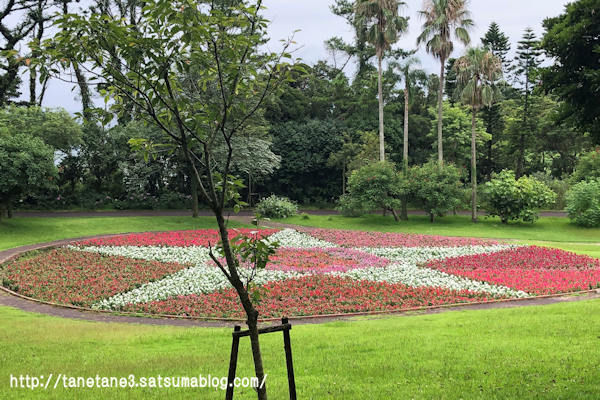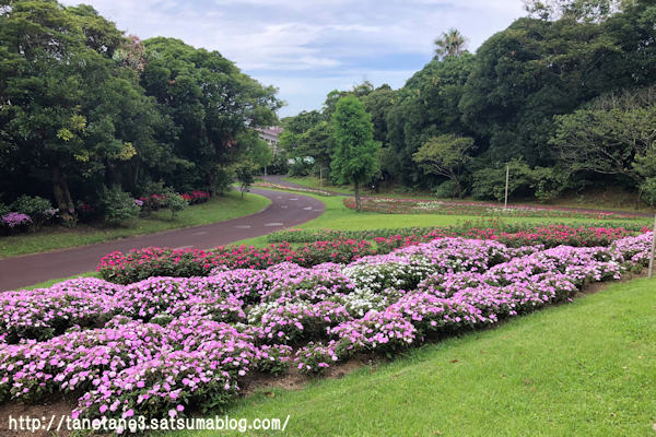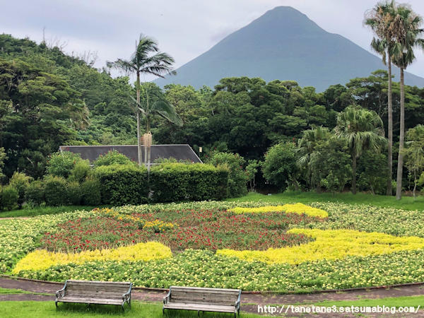 カラフルな花壇と松林やヤシの木を通して見る開聞岳はとても印象的。